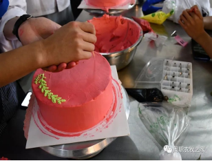 将蛋糕坯放在桌上,涂抹上新鲜打发的奶油,点缀上色彩丰富的点饰,裱上小党旗…同学们干得热火朝天。