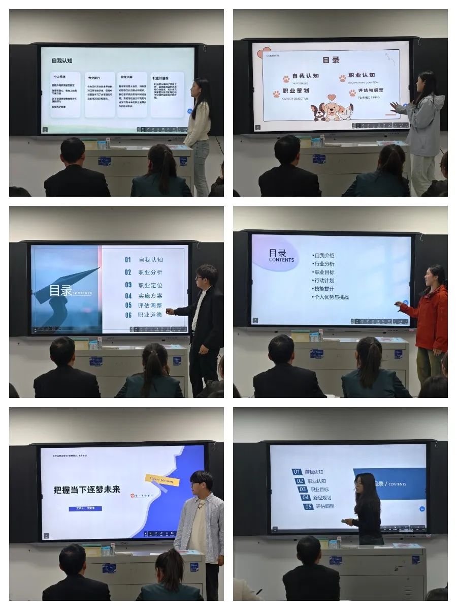 比赛过程中,各位选手展示了个人职业生涯规划测评数据,对自身优势与劣势进行了深度剖析及个人职业方向进行深度解读,并针对个人职业目标制定了短期和长期的实施行动计划。同学们及评委老师聚精会神的聆听他们对自我的认知、对自己职业的规划。期间,评委老师会根据参赛者的展示提出相应的问题和建议。