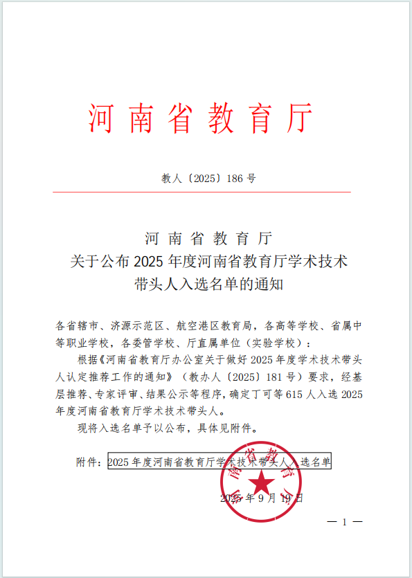 近日,河南省教育厅发布了《河南省教育厅关于公布2025年度河南省教育厅学术技术带头人入选名单的通知》[教人〔2025〕186 号],我院教师孙留霞成功入选。