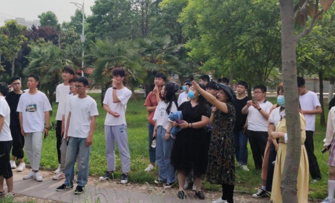 在校园内,老师为同学们讲解了多种园林树木及花卉的特征,识别和养护的要点,并讲如何快速识别相似的树木,有些同学主动向老师提出问题。最后,老师一一给予答复。