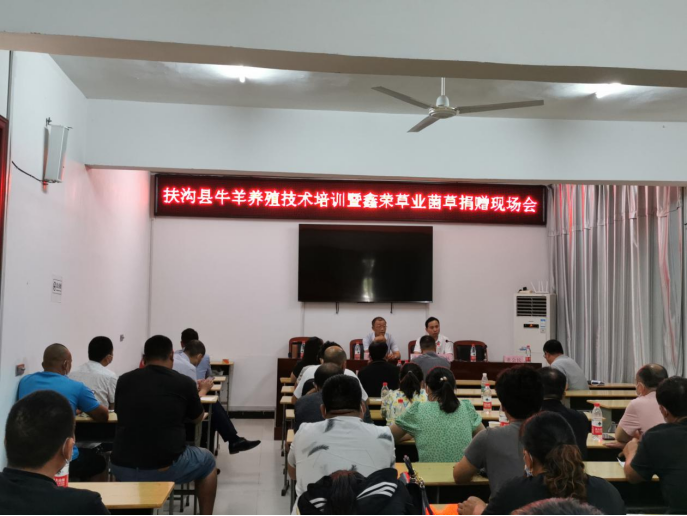 扶沟县农业农村局副局长董会民主持会议,他首先介绍了到会的的各位专家和捐赠企业代表,然后讲到在养殖场受灾后举办此次养殖技术交流暨菌草捐赠现场会的意义,之后由市农业农村局刘建中总畜牧师主讲牛羊的饲养管理技术、未来牛羊业的发展状况、牛羊免疫程序的重要性,得到了与会者的高度认可。