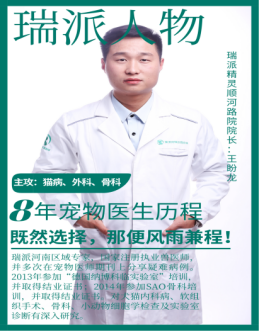 王盼龙,2013年毕业于周口职业技术学院,畜牧兽医专业。瑞派郑州精灵宠物医院院长,瑞派河南区域专家,国家注册执业兽医师,2018年被评为优秀兽医师,常州道格医疗科技有限公司特约讲师,深圳众宠联合教育咨询科技有限公司特约讲师,深圳市墨觅科技有限公司特约讲师,河南力派宠物人才技能培训学校特聘讲师,瑞康连锁宠物医院技术总院长,精瑞灵宠物医院有限公司技术院长,多次去国外学术交流,多次担任行业大型会议讲师。医院设有CT影像专科,神经外科,微创,内窥镜,体外冲击波碎石,骨科,软组织外科,猫科等特色专科,多次被评为郑州市创业先进个人。